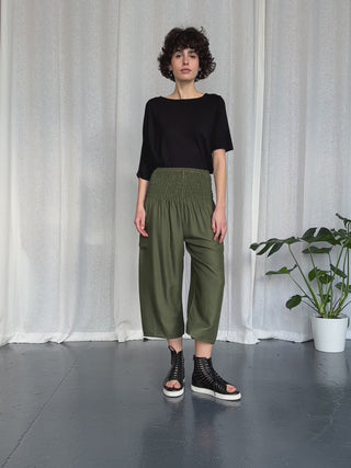 The Cropped has the same shirred waistband and roomy hip area, but with wide calf length legs. The shorter length made them ideal for the hot summer days.