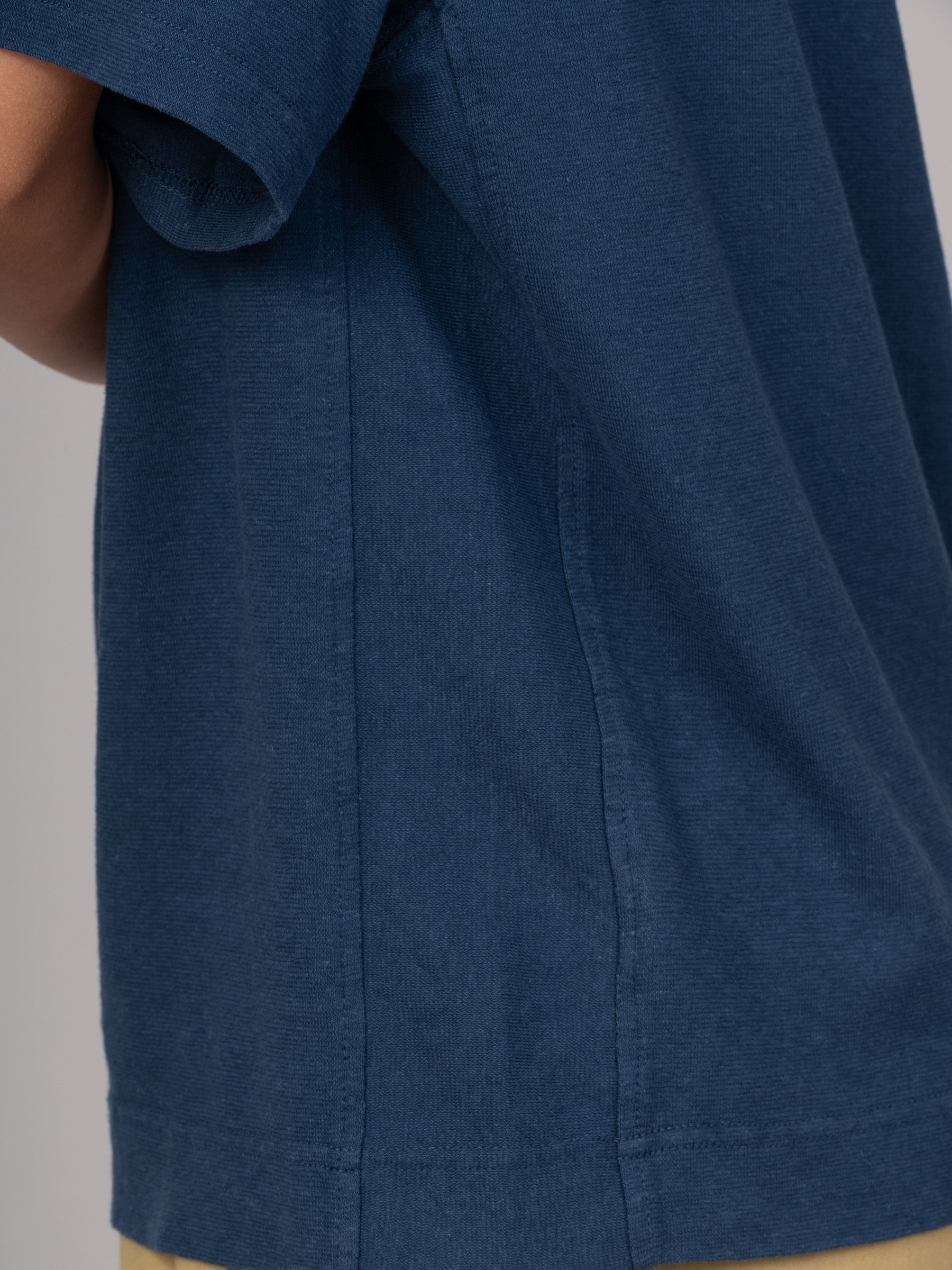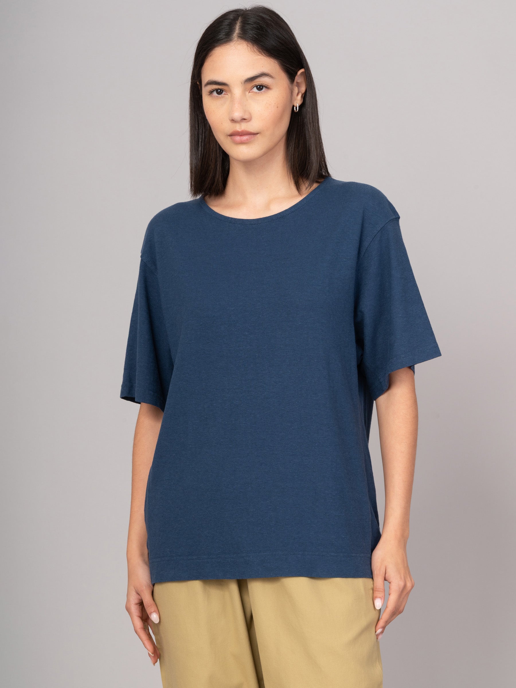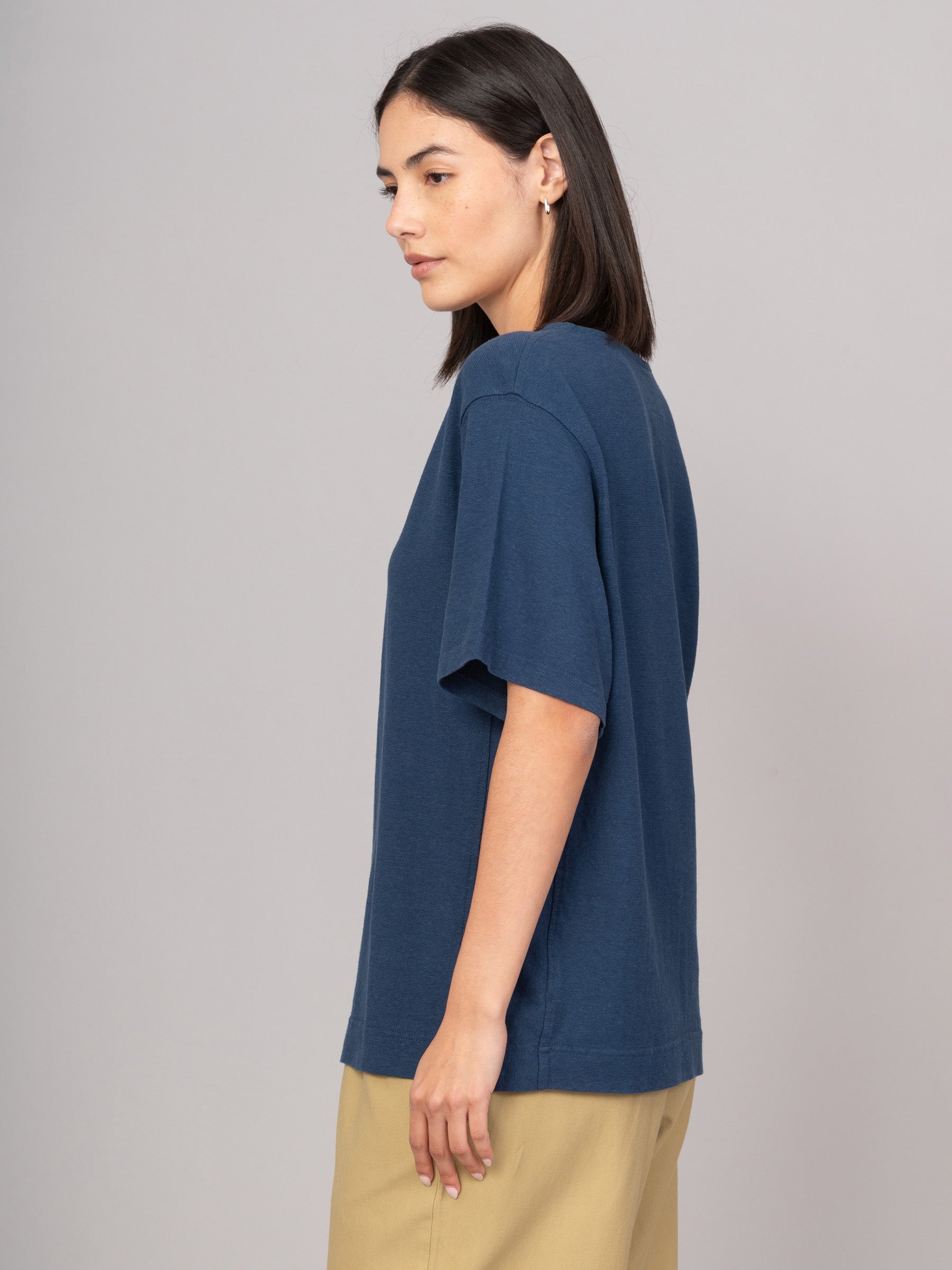 This Vigo T-Shirt is cut from our signature hemp–organic cotton jersey, known for its soft yet structured feel. Like the rest of the Vigo line, it features tailored side panels and felted seams that help maintain its clean silhouette through repeated wear. This version updates the neckline with refined bias binding in place of rib, while the pre-washed fabric offers a smooth hand feel, a naturally dry touch, and an organically textured surface.