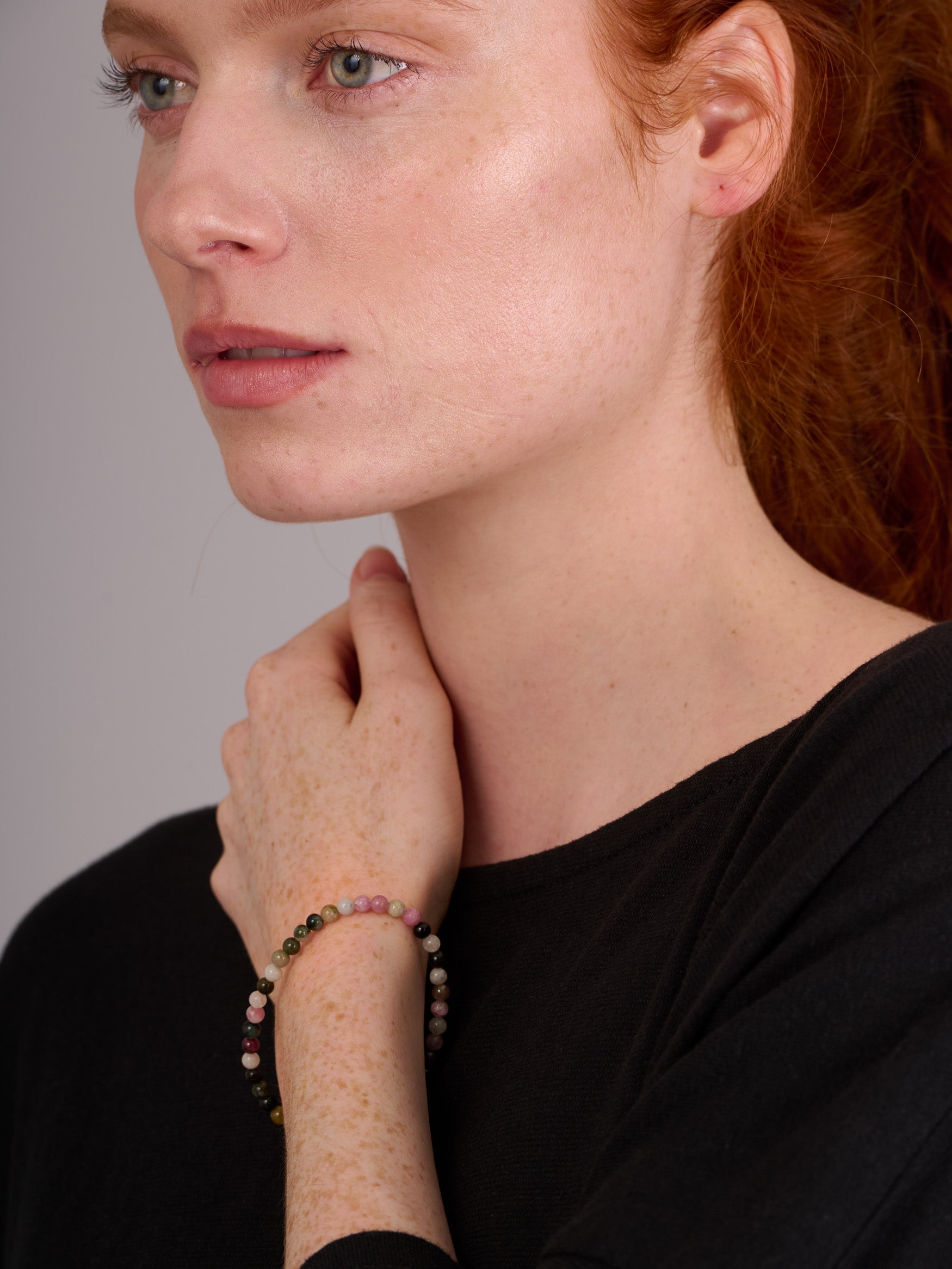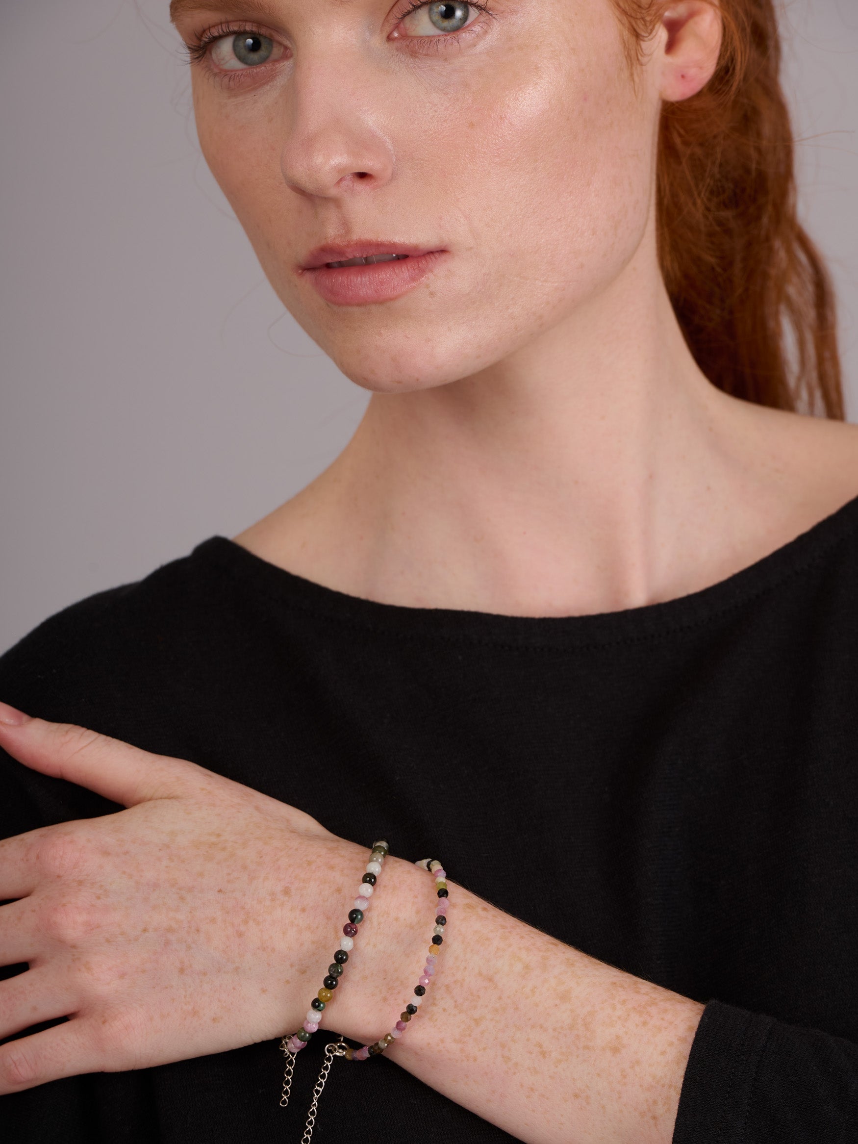 Delicate and yet full of character, this tourmaline bracelet features smooth round beads in an elegant gradient of pink, green, and earthy tones—each one naturally unique. Finished with a fine 925 sterling silver chain, it offers a playful take on everyday gemstone jewellery.