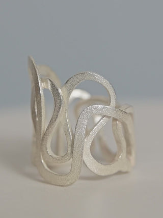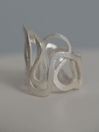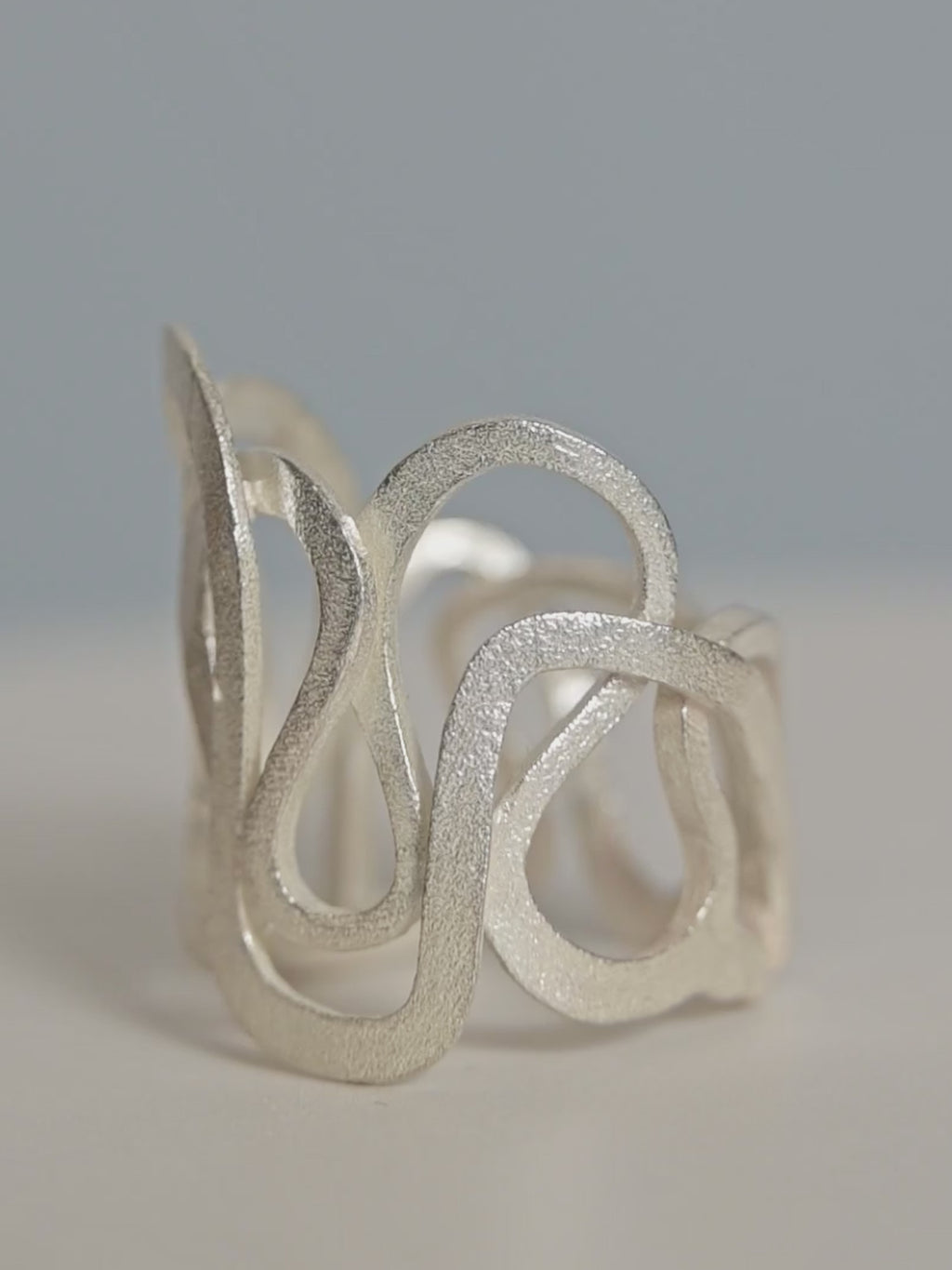 Handcrafted in 925 sterling silver, this statement ring features an abstract line form. Its sculptural quality and oversized design make it a perfect complement to any bold modern style. Size can be adjusted slightly.