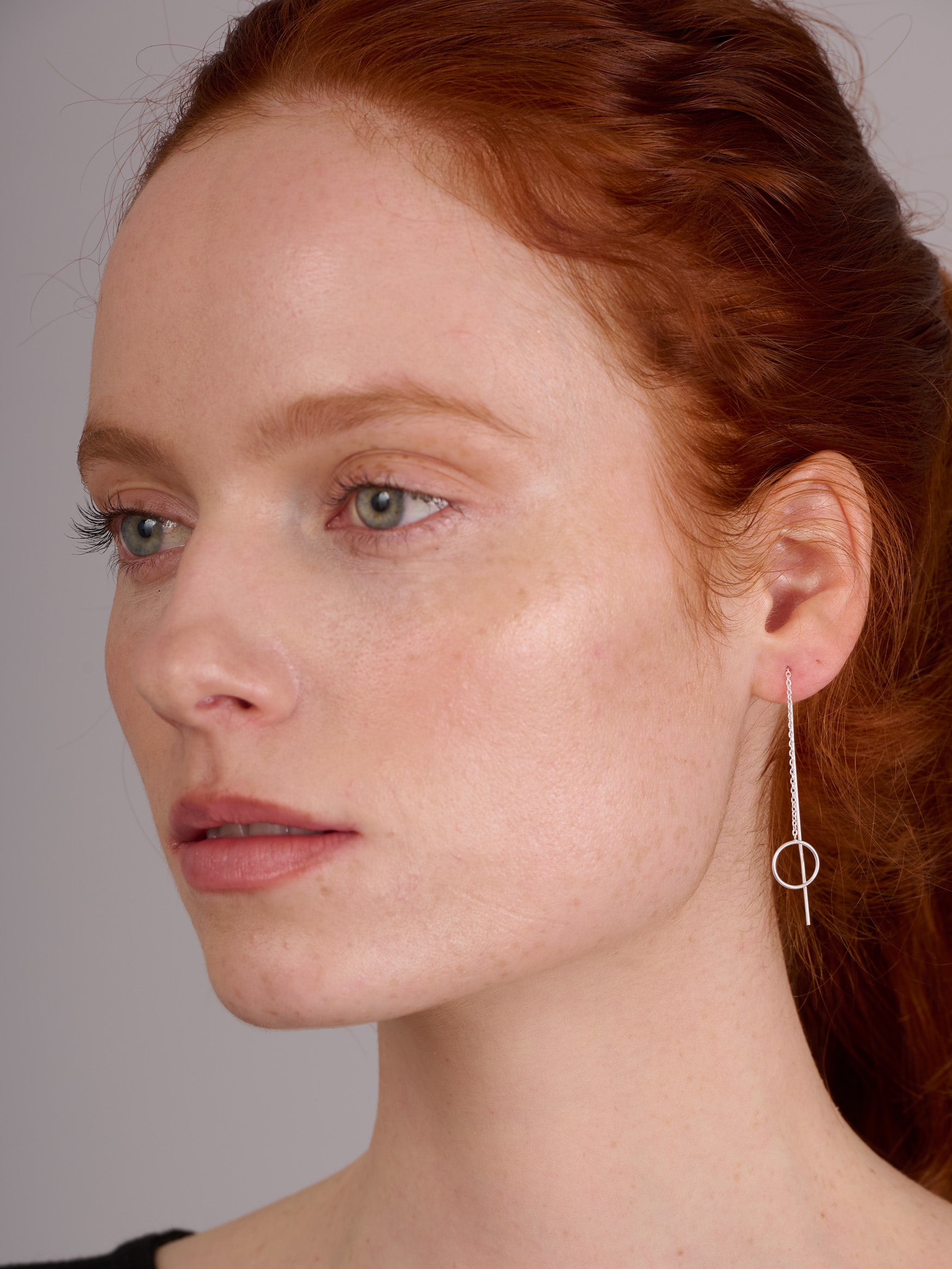 Crafted from 925 sterling silver, these sleek threader earrings feature a delicate chain anchored by a small polished circle at the front. A long, needle-like bar at the back adds balance and structure, creating a minimal yet striking silhouette.