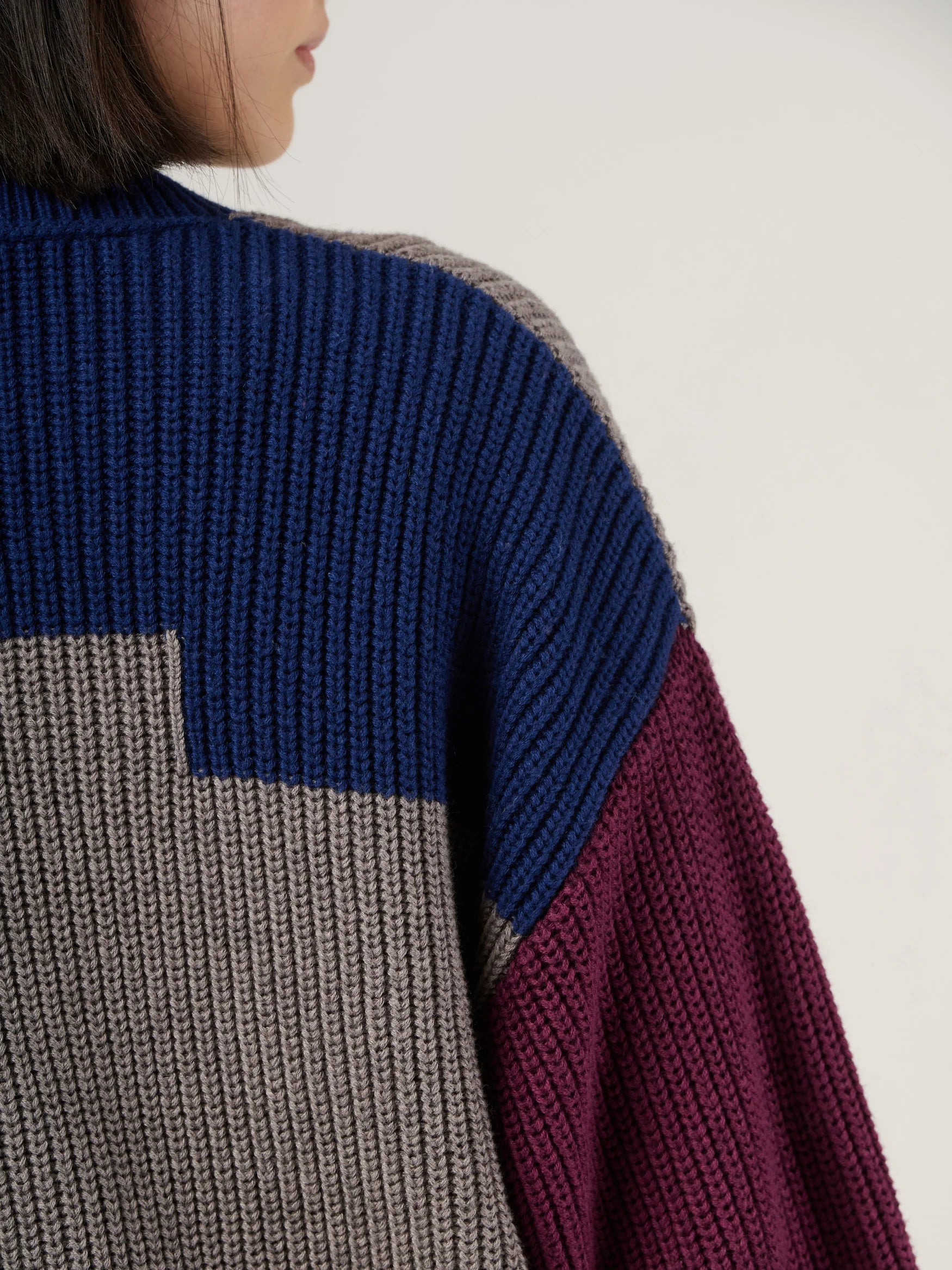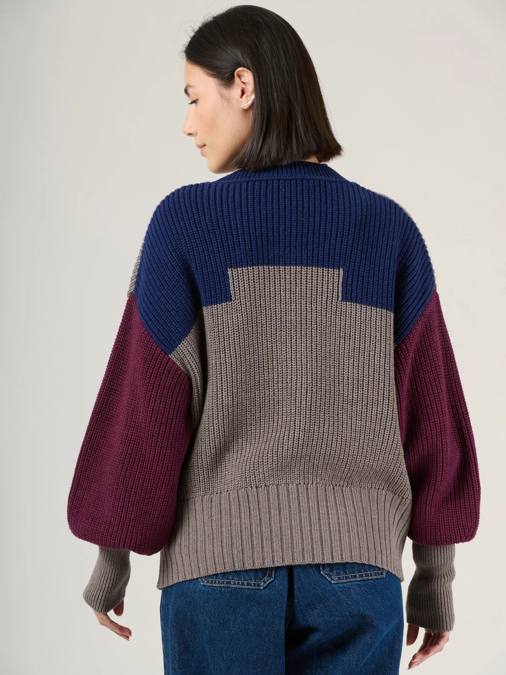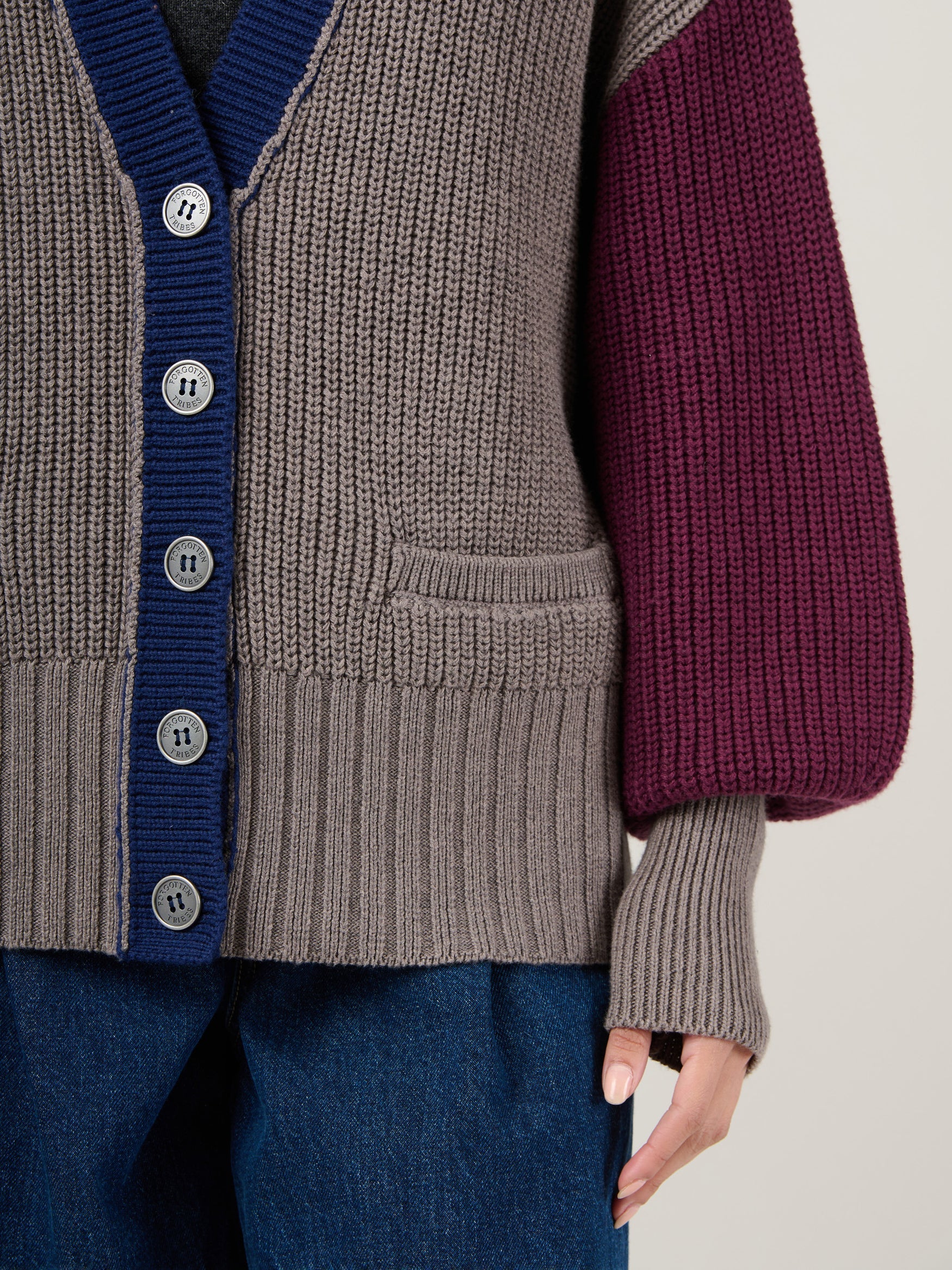 Knit from an all-natural wool and cotton blend yarn, this cardigan features a playful color-block design. Its loose-fitting silhouette is complemented by a V-neckline, while balloon sleeves with long cuffs add visual interest. Designed for both style and convenience, it includes two front pockets. Versatile and chic, this cardigan can be worn as a mid-layer or outerwear, making it a staple piece in your wardrobe.