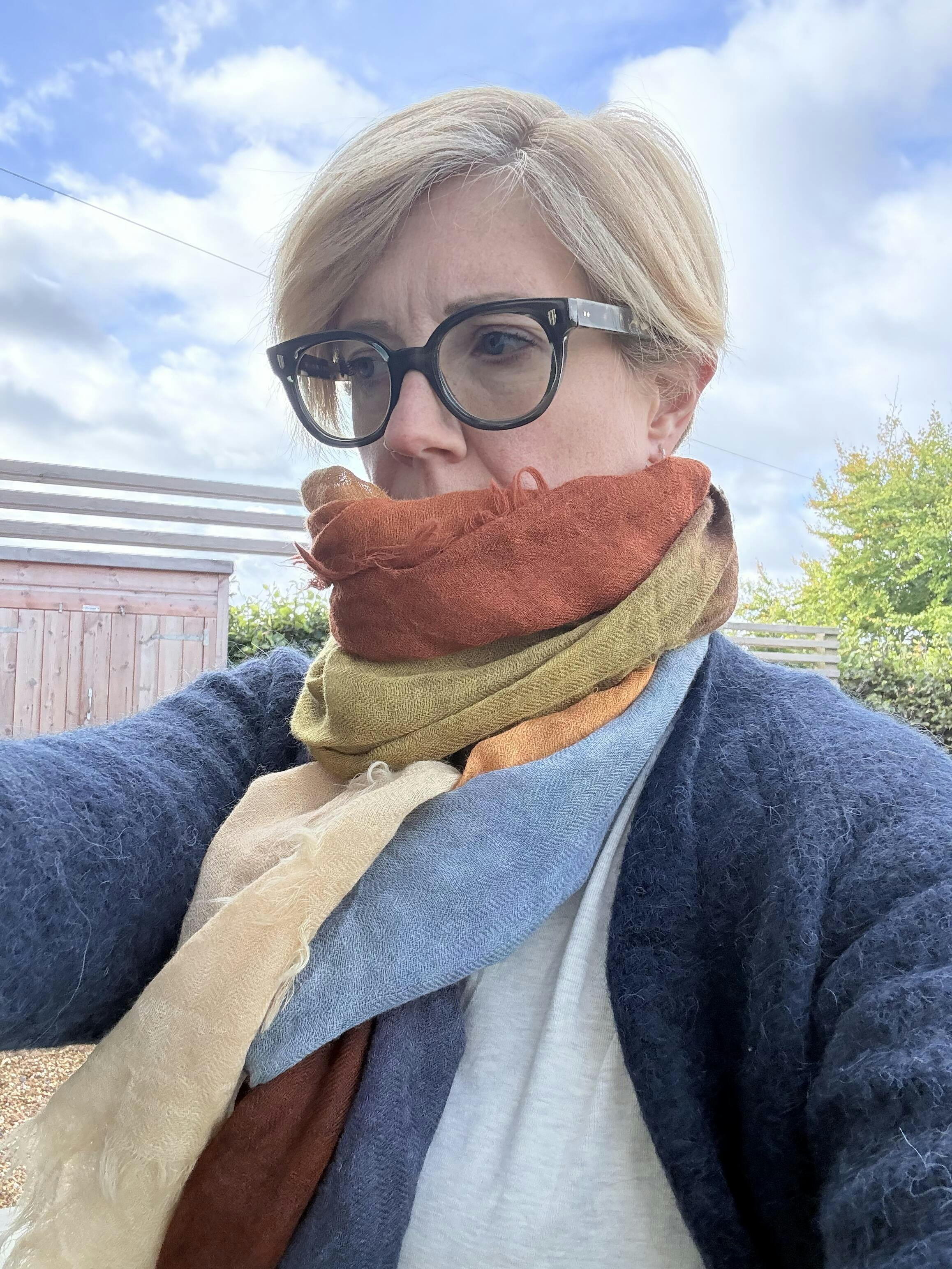 Made with soft pure fine wool, this generously sized scarf is woven into a small herringbone pattern, which creates an even surface texture. It features a soft yellow, green and blue colour gradient.