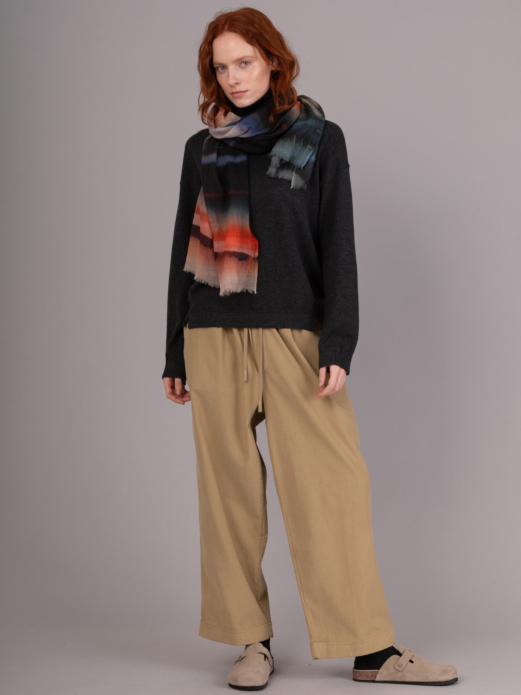 Made with pure fine wool, this scarf is delicate and ultra soft. The abstract print blends shades of red, purple, grey, and navy, coming together in a design that echoes the soft, dusky sky.