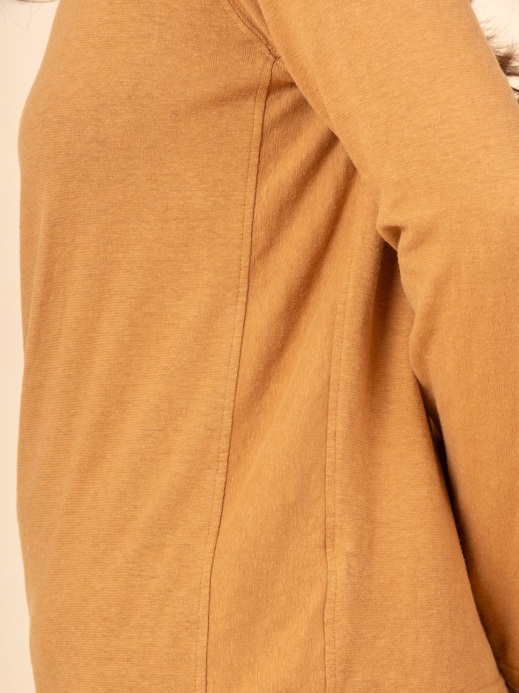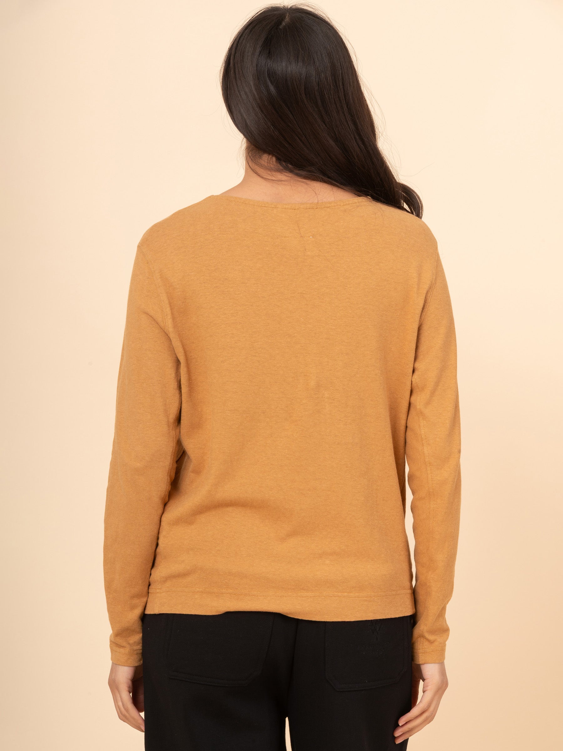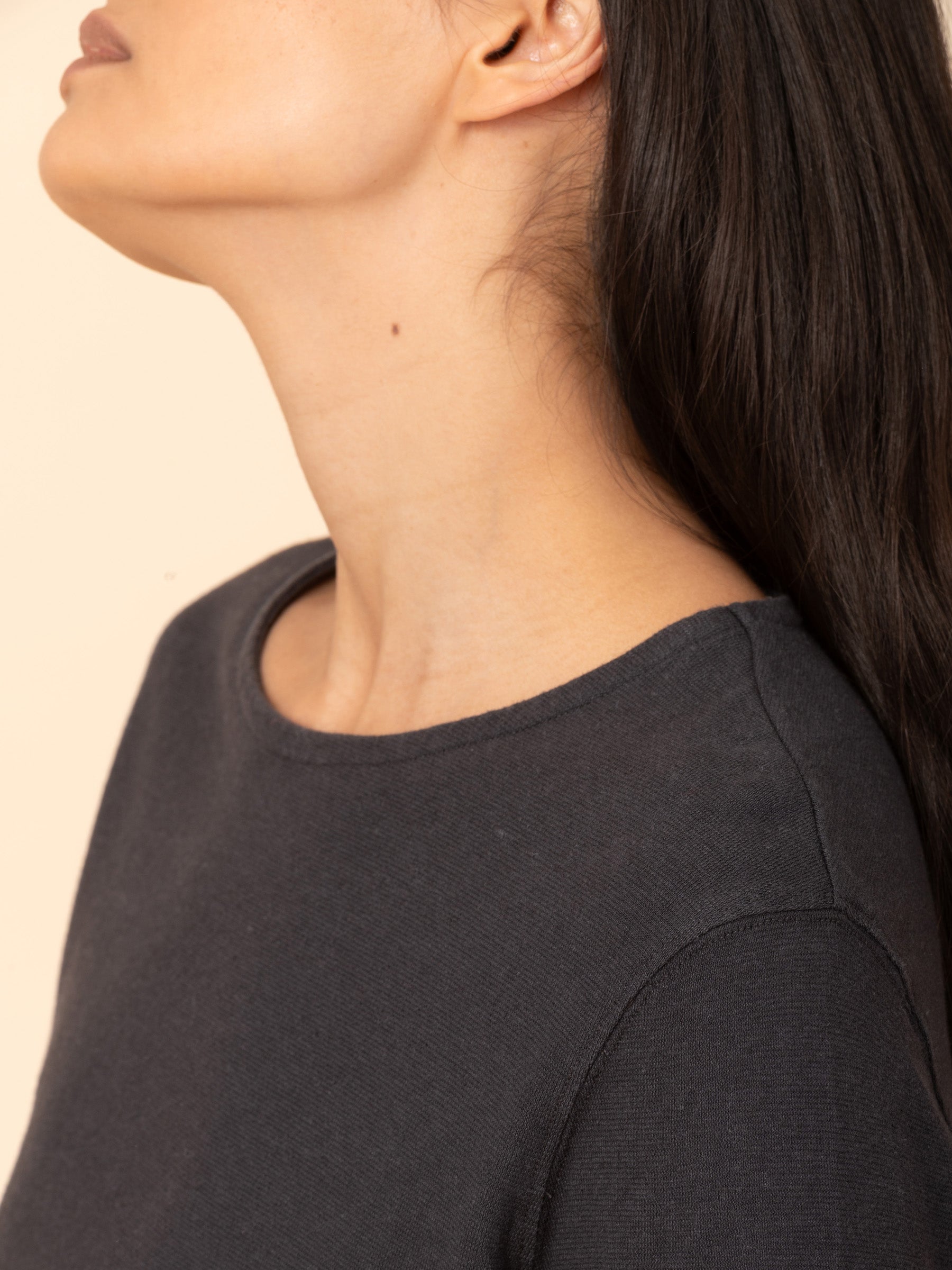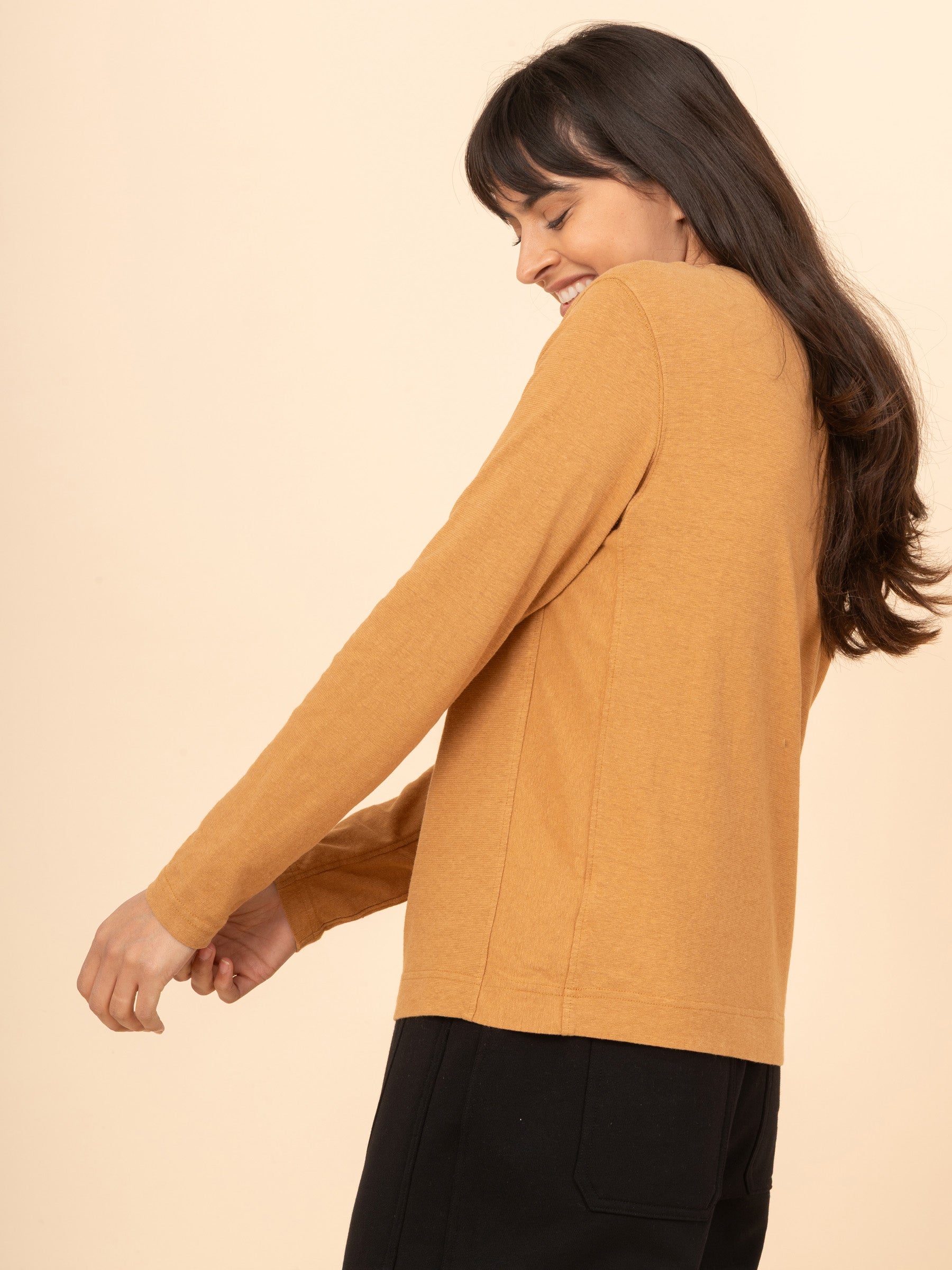 This Gili T-Shirt is crafted from our signature hemp–organic cotton jersey, offering a naturally soft feel with lasting structure. Like the rest of the Gili line, it features long, close-fitting sleeves and side panels cut on the cross-grain to maintain its shape. This version updates the look with a smooth bias-bound round neckline in place of the ribbed mock neck, creating a refined, versatile piece that transitions effortlessly from casual to polished styling.