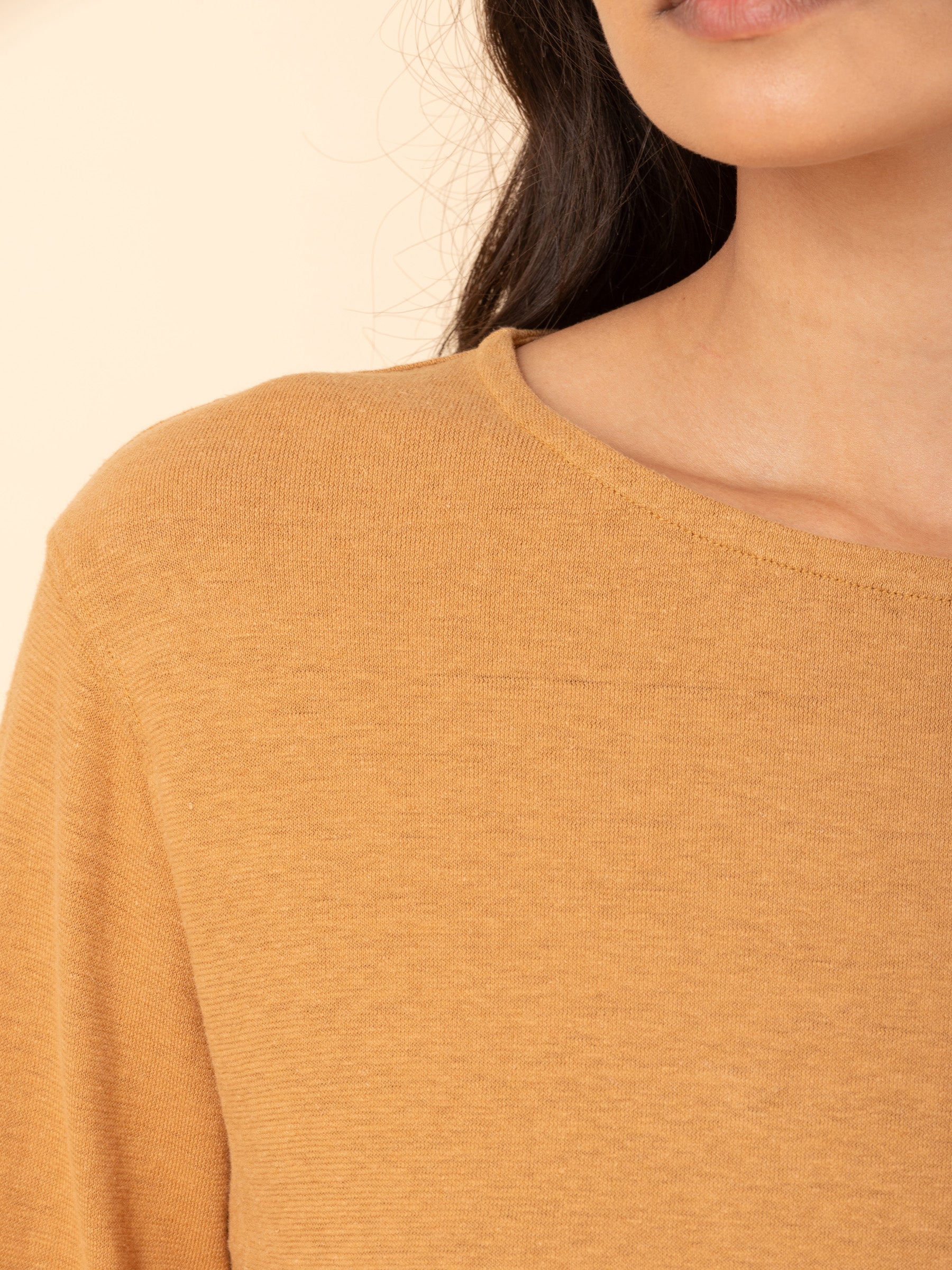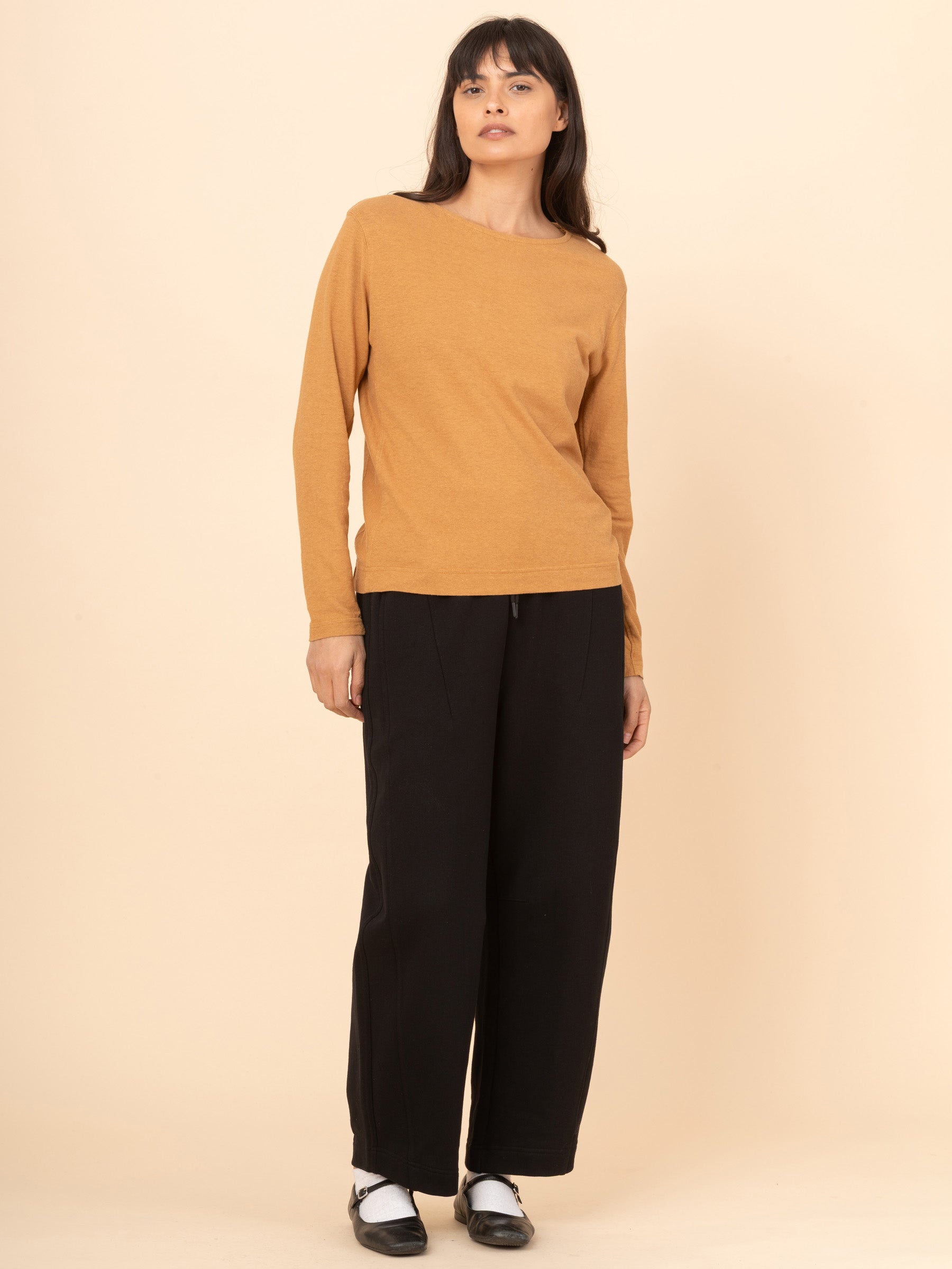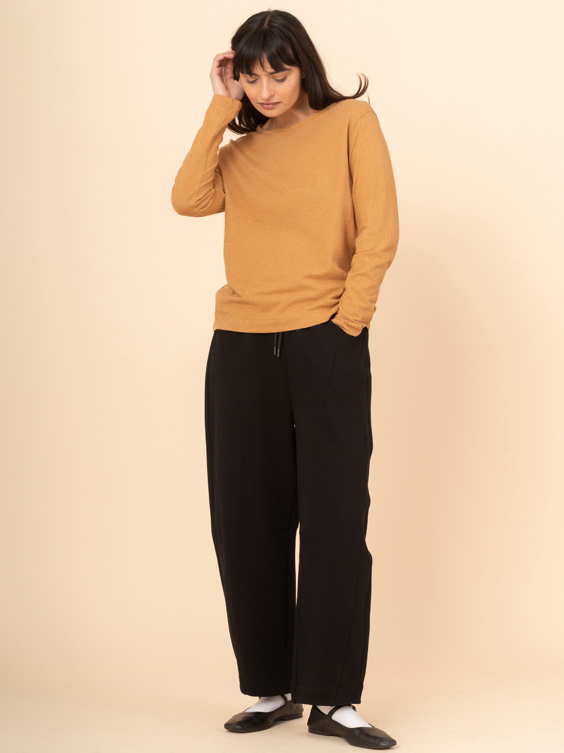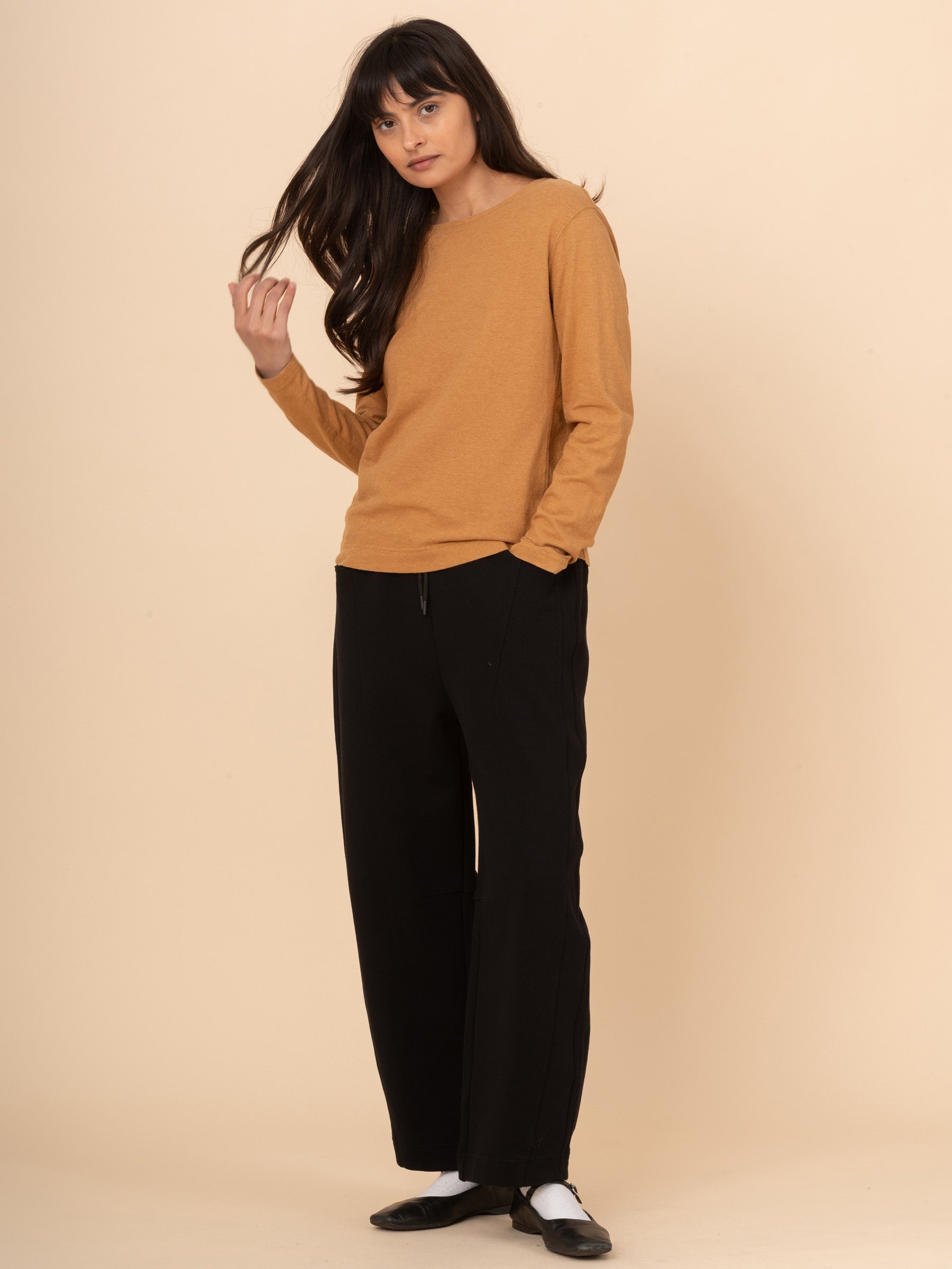 This Gili T-Shirt is crafted from our signature hemp–organic cotton jersey, offering a naturally soft feel with lasting structure. Like the rest of the Gili line, it features long, close-fitting sleeves and side panels cut on the cross-grain to maintain its shape. This version updates the look with a smooth bias-bound round neckline in place of the ribbed mock neck, creating a refined, versatile piece that transitions effortlessly from casual to polished styling.