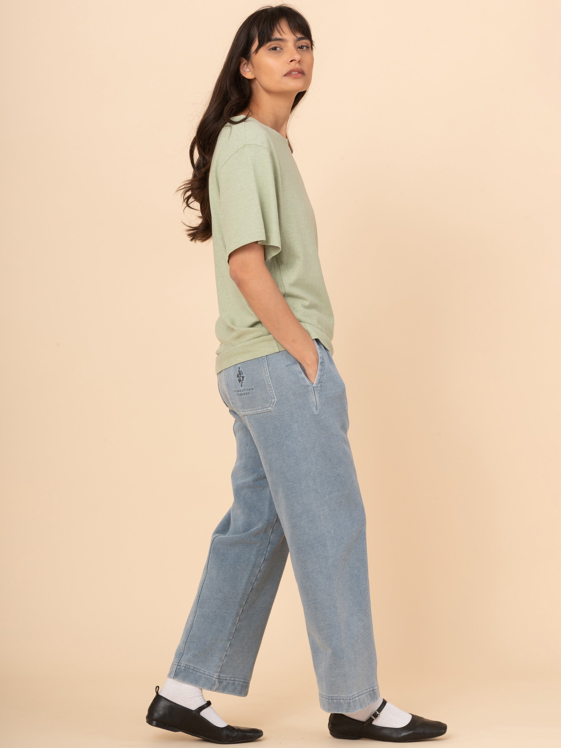 This Vigo T-Shirt is cut from our signature hemp–organic cotton jersey, known for its soft yet structured feel. Like the rest of the Vigo line, it features tailored side panels and felted seams that help maintain its clean silhouette through repeated wear. This version updates the neckline with refined bias binding in place of rib, while the pre-washed fabric offers a smooth hand feel, a naturally dry touch, and an organically textured surface.